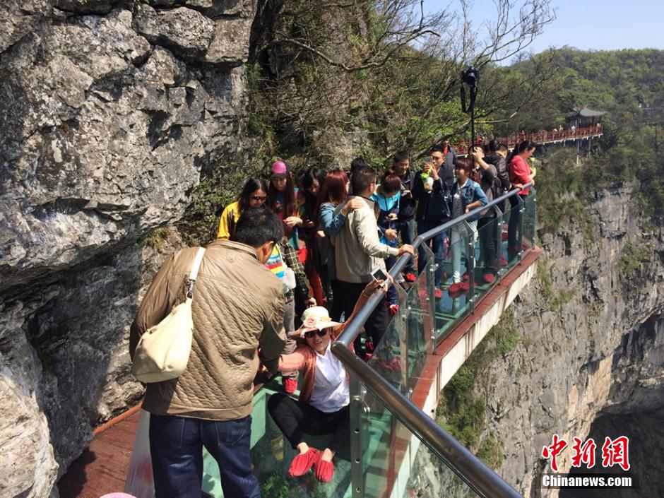 4月中旬,湖南张家界天门山西线玻璃栈道关闭进行维护整修,预计“五一”小长假恢复对外开放。为了不让想体验天门山玻璃栈道的游客失望而归,天门山顶东线一条更刺激的玻璃栈道近日正式对外开放。东线玻璃栈道位于海拔1400余米的天门洞顶部崖壁之上,全长60米,宽1.6米,相较于西线视野更开阔、刺激惊险程度也更胜一筹。丁云娟 摄