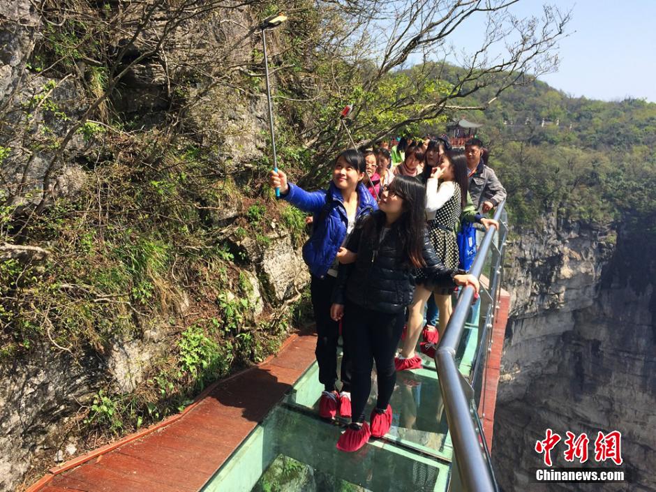 4月中旬,湖南张家界天门山西线玻璃栈道关闭进行维护整修,预计“五一”小长假恢复对外开放。为了不让想体验天门山玻璃栈道的游客失望而归,天门山顶东线一条更刺激的玻璃栈道近日正式对外开放。东线玻璃栈道位于海拔1400余米的天门洞顶部崖壁之上,全长60米,宽1.6米,相较于西线视野更开阔、刺激惊险程度也更胜一筹。丁云娟 摄