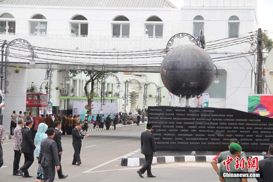 4月24日,印尼万隆亚非会议60周年纪念大会开幕。新设在市中心的地球纪念碑成为印尼万隆市新的标志物。 纪念碑形同一个地球,由铜片制成,象征全球一家人和亚非人民觉醒了。纪念碑的设立是为迎接亚非会议60周年。纪念碑写有大字Asia Afrika以及印尼前总统苏加诺的名言“让新的亚洲和新的非洲诞生吧”。纪念碑的墙壁上写有参加亚非会议的国家的名字,已成为民众和游客的新旅游景点。中新社发 顾时宏 摄