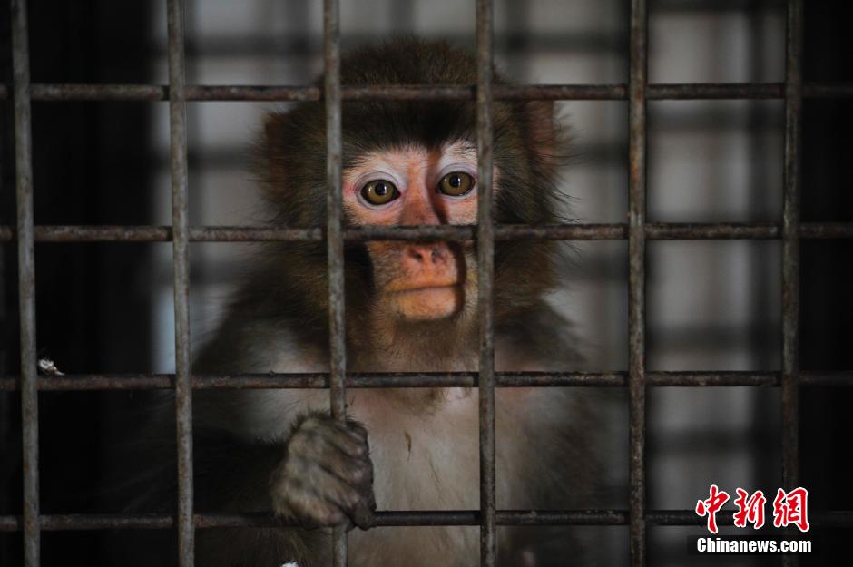 4月24日,放生前在保护区兽医院进行隔离观察的猕猴。中新社发 刘冉阳 摄