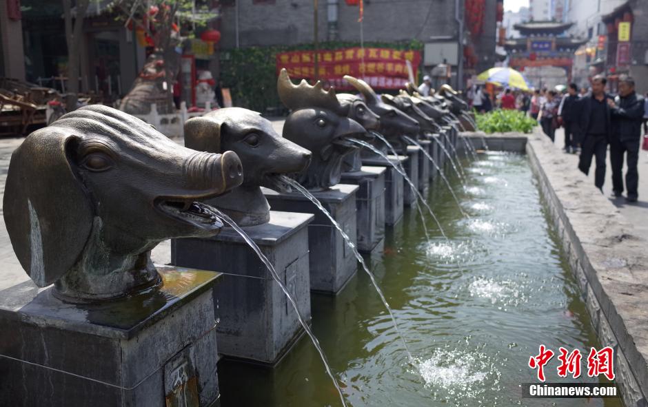 4月25日,山西太原街头正在喷水的山寨版“圆明园十二兽首”格外的吸引市民的目光。圆明园十二兽首是著名文物,1860年英法联军火烧圆明园,十二兽首流失海外,截至2014年,仅鼠首、牛首、虎首、兔首、马首、猴首、猪首回到大陆,龙首在台湾,蛇首、羊首、鸡首、狗首下落不明,成为圆明园海外流失文物的象征。中新社发 泱波 摄
