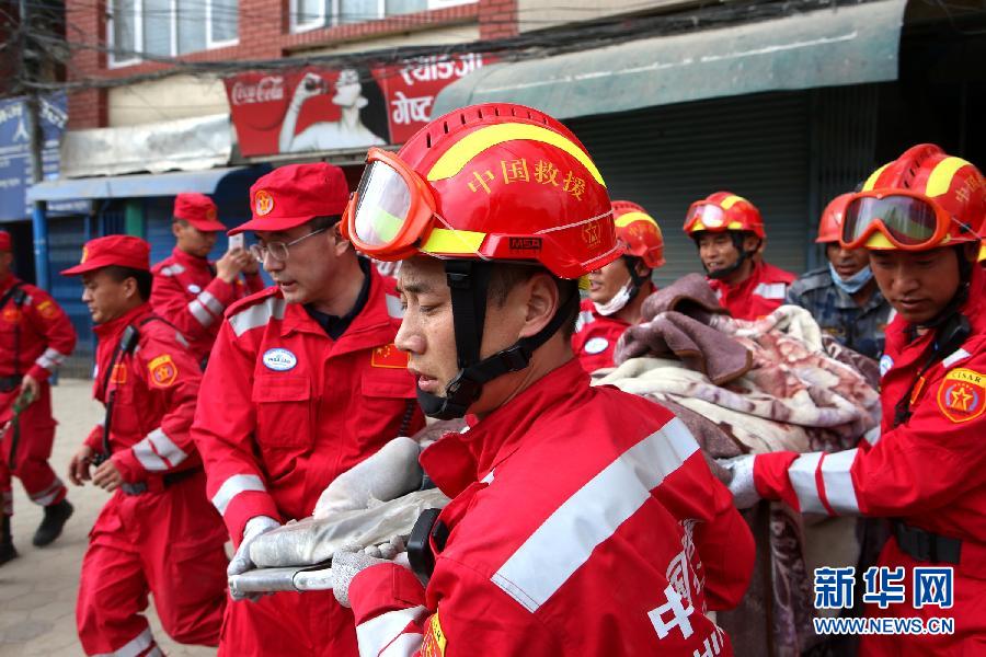 4月26日,在尼泊尔首都加德满都,搜救队员从坍塌的楼房中抬出一名幸存者。中国国际救援队26日到达尼泊尔后,经过4小时艰苦搜救,在加德满都西北部发现一名幸存的20多岁男青年。这是中国国际救援队发现的第一名幸存者。目前搜救工作仍在继续。新华社记者白阳摄