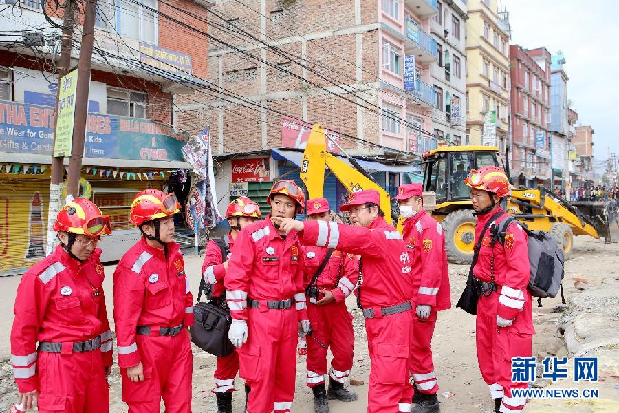 4月26日,在尼泊尔首都加德满都,搜救队员商讨救援方案。中国国际救援队26日到达尼泊尔后,经过4小时艰苦搜救,在加德满都西北部发现一名幸存的20多岁男青年。这是中国国际救援队发现的第一名幸存者。目前搜救工作仍在继续。新华社记者白阳摄