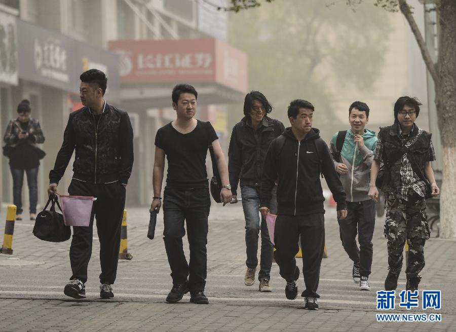 4月27日,几位市民冒着风沙在乌鲁木齐市光明路上行走。
