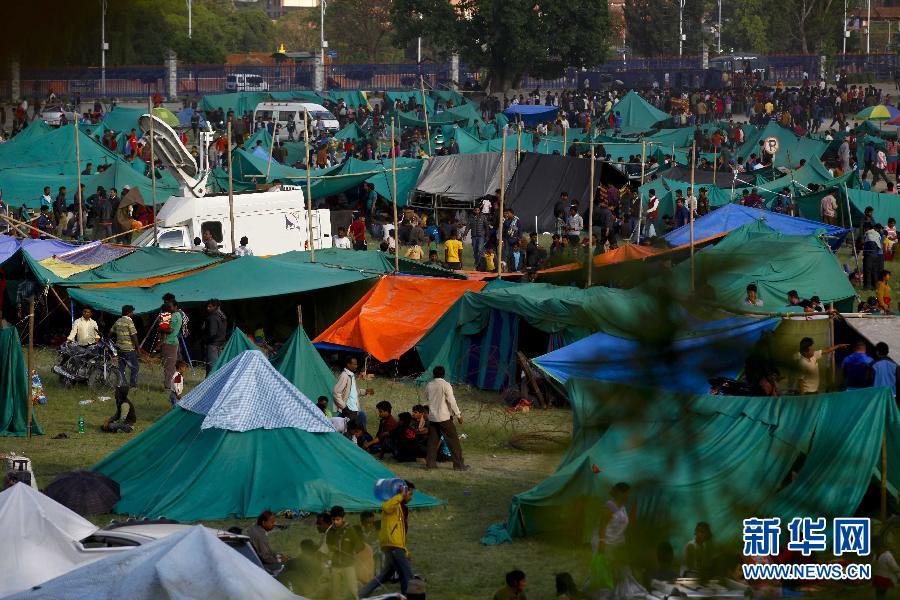 4月26日,在尼泊尔加德满都的敦迪凯尔广场,人们居住在临时搭建的帐篷中。尼泊尔警方一名负责官员27日说,目前已确认有3218人在地震中遇难。 新华社发(普拉塔普·塔帕摄)
