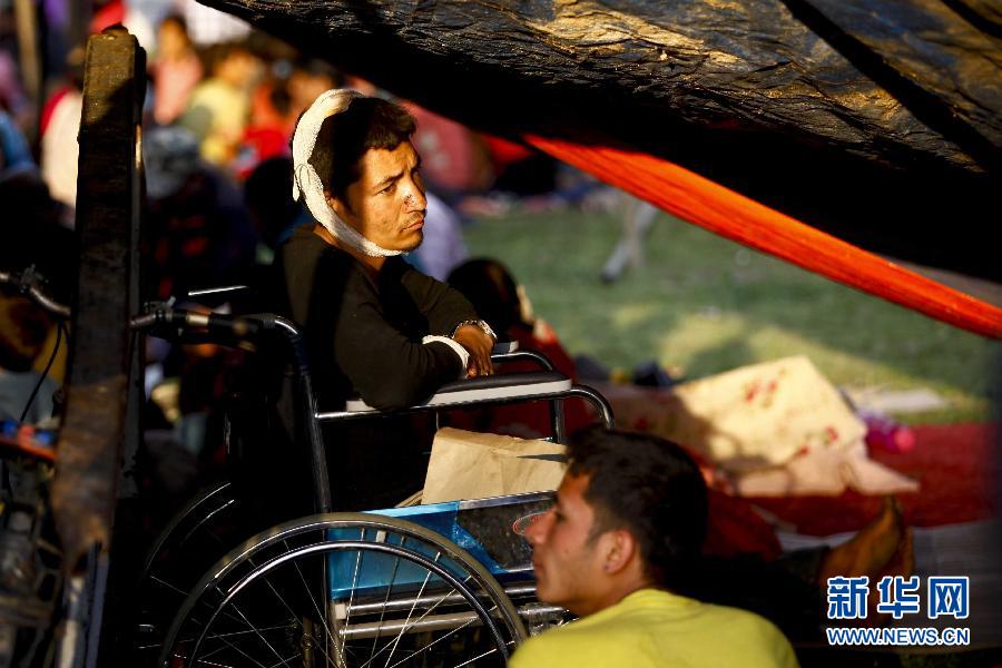 4月26日,在尼泊尔加德满都的敦迪凯尔广场,一名受伤男子在帐篷中休息。尼泊尔警方一名负责官员27日说,目前已确认有3218人在地震中遇难。 新华社发(普拉塔普·塔帕摄)