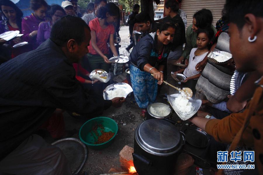 4月26日,在尼泊尔加德满都的敦迪凯尔广场,人们领取食物。 尼泊尔警方一名负责官员27日说,目前已确认有3218人在地震中遇难。新华社发(普拉塔普·塔帕摄)