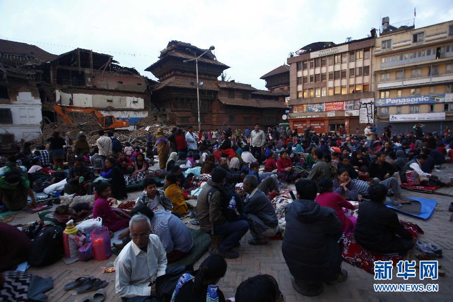 4月26日,人们在尼泊尔加德满都一处广场避难休息。尼泊尔警方一名负责官员27日说,目前已确认有3218人在地震中遇难。 新华社发(普拉塔普·塔帕摄)