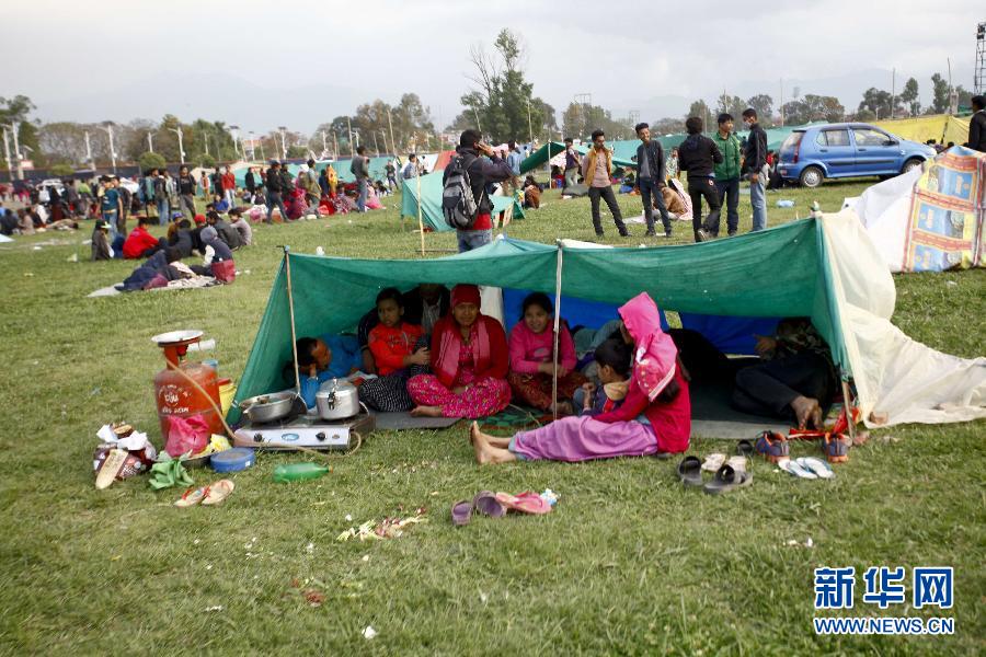 4月26日,在尼泊尔加德满都的敦迪凯尔广场,人们在帐篷里休息。 尼泊尔警方一名负责官员27日说,目前已确认有3218人在地震中遇难。新华社发(普拉塔普·塔帕摄)