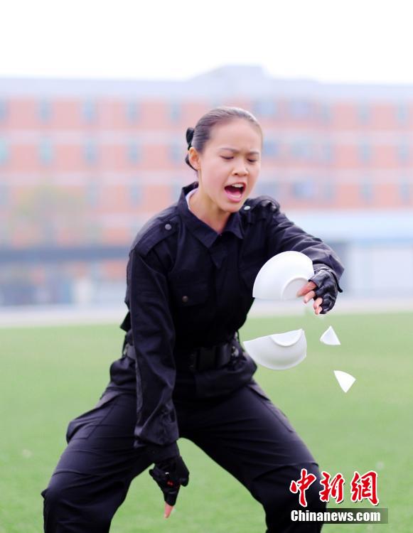近日,四川成都某航空专修学院的准空姐们加强训练,一秒钟内学生们就从“女神”范儿十足的优雅空姐变成了女汉子,关键时刻一招制敌。据悉,准空姐们除了学习专业的空乘礼仪知识之外,还要学会擒拿格斗,特别是女生要求能单手碎碗、劈砖等。钟欣 摄