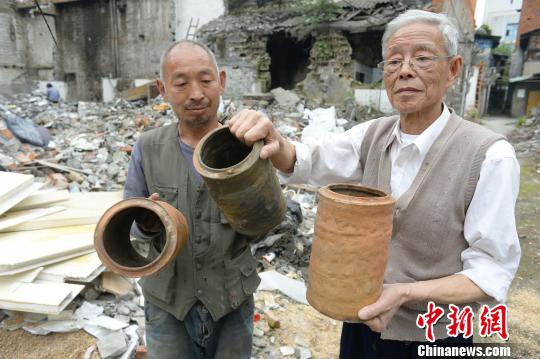 近日,在湖北省宜昌市老城改造献福路拆迁工地,意外发现两米多长的一段明清时期城市用陶制排水管。排水管已有两三百年历史 王康明 摄