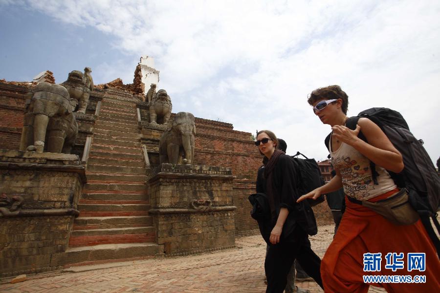 4月26日,在尼泊尔巴克塔普尔,游客经过一座在地震中坍塌的寺庙。 尼泊尔警方一名负责官员27日说,目前已确认有3218人在地震中遇难。新华社发(普拉塔普·塔帕摄)