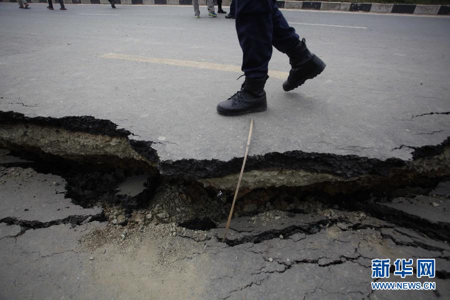 4月26日,在尼泊尔巴克塔普尔,一名男子走过地震中损毁的道路。 尼泊尔警方一名负责官员27日说,目前已确认有3218人在地震中遇难。新华社发(普拉塔普·塔帕摄)