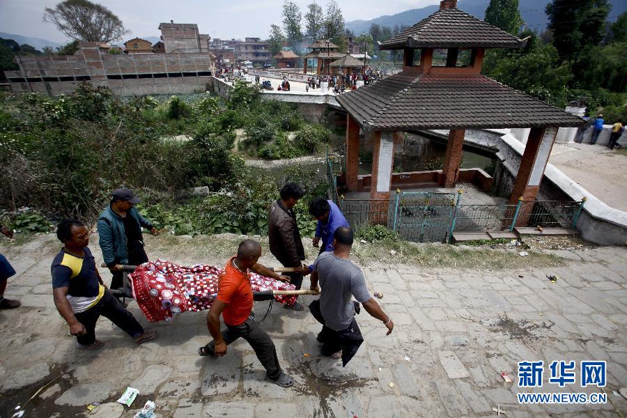 4月26日,在尼泊尔巴克塔普尔,尼泊尔武装警察转移一名遇难者遗体。尼泊尔警方一名负责官员27日说,目前已确认有3218人在地震中遇难。 新华社发(普拉塔普·塔帕摄)