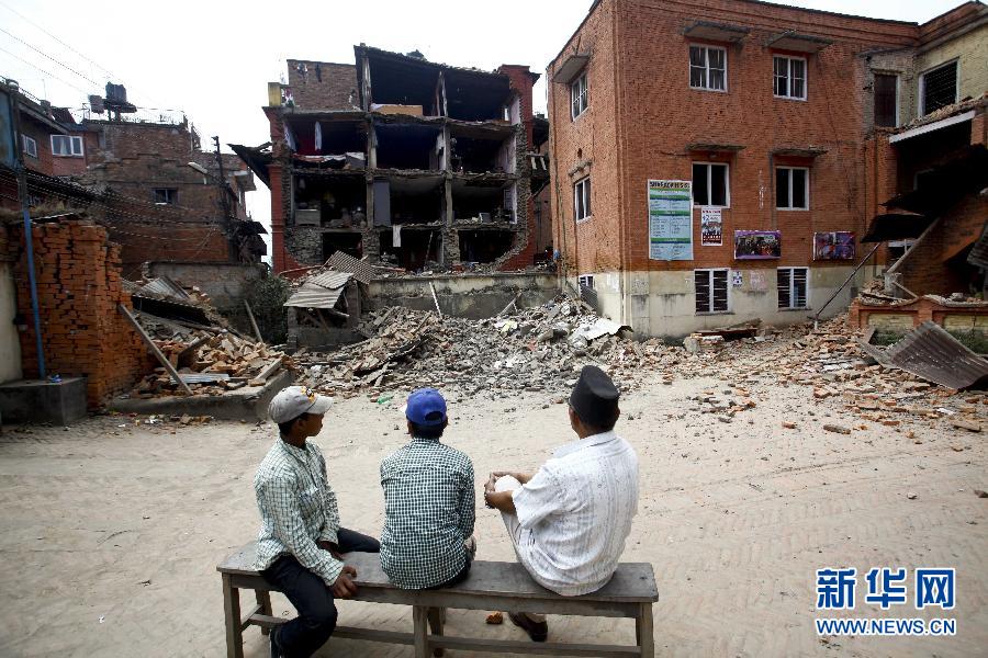 4月26日,在尼泊尔巴克塔普尔,人们看着一所在地震中损毁的学校。 尼泊尔警方一名负责官员27日说,目前已确认有3218人在地震中遇难。新华社发(普拉塔普·塔帕摄)