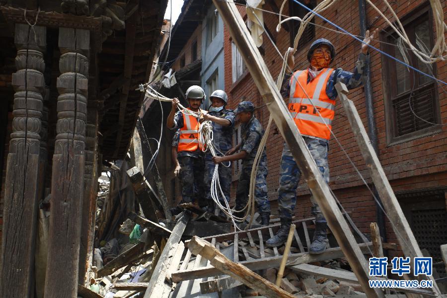 4月26日,在尼泊尔巴克塔普尔,尼泊尔武装警察援救被困在房屋里的灾民。尼泊尔警方一名负责官员27日说,目前已确认有3218人在地震中遇难。 新华社发(普拉塔普·塔帕摄)