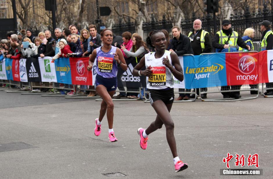 4月26日,2015年伦敦马拉松赛举行,图为两名残疾人选手参加比赛。参加今年伦敦马拉松赛的人数创下历史纪录,约有37800人参赛。 中新社发 周兆军 摄