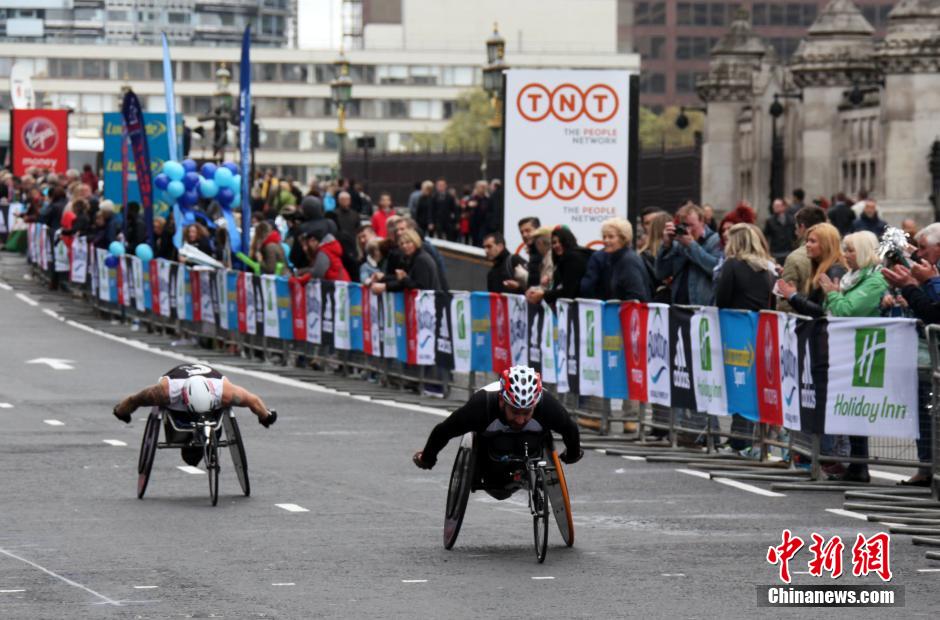4月26日,2015年伦敦马拉松赛举行,图为两名残疾人选手参加比赛。参加今年伦敦马拉松赛的人数创下历史纪录,约有37800人参赛。 中新社发 周兆军 摄