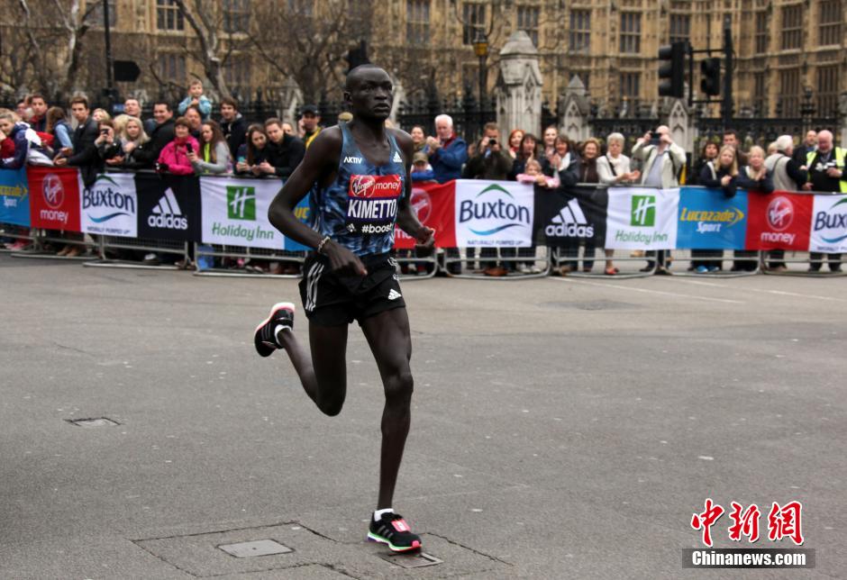 4月26日,2015年伦敦马拉松赛举行,肯尼亚长跑名将金梅托获得男子组季军。伦敦马拉松赛创办于1981年,每年都吸引全世界最优秀的选手参赛。 中新社发 周兆军 摄