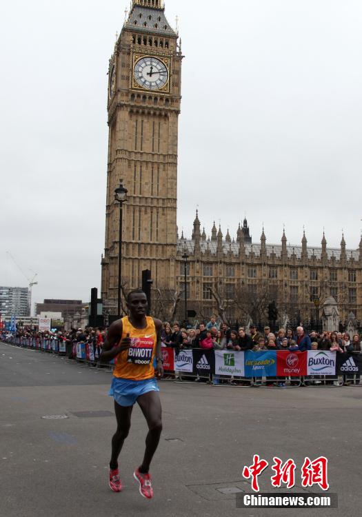 4月26日,2015年伦敦马拉松赛举行,图为一名选手跑过伦敦地标大本钟。参加今年伦敦马拉松赛的人数创下历史纪录,约有37800人参赛。 中新社发 周兆军 摄