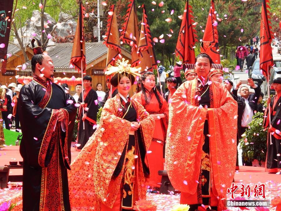 4月26日,近百对新人在道教名山河南栾川老君山着汉式婚服、行古礼举行集体婚典。在司礼、侍女、侍卫、赞礼官的引领下,新人们身着汉式婚服,完成了传统汉婚中的沃盥、对席、同牢、合卺、解缨、盟誓、执手等流程,在59米高的老子像前许下幸福约定。此次汉服婚典中,一对外籍新人格外引人注目,新郎是来自白俄罗斯的IOSIFSIARHEI,新娘是来自印度尼西亚的INDRIMEILINDA。 曹福川 摄