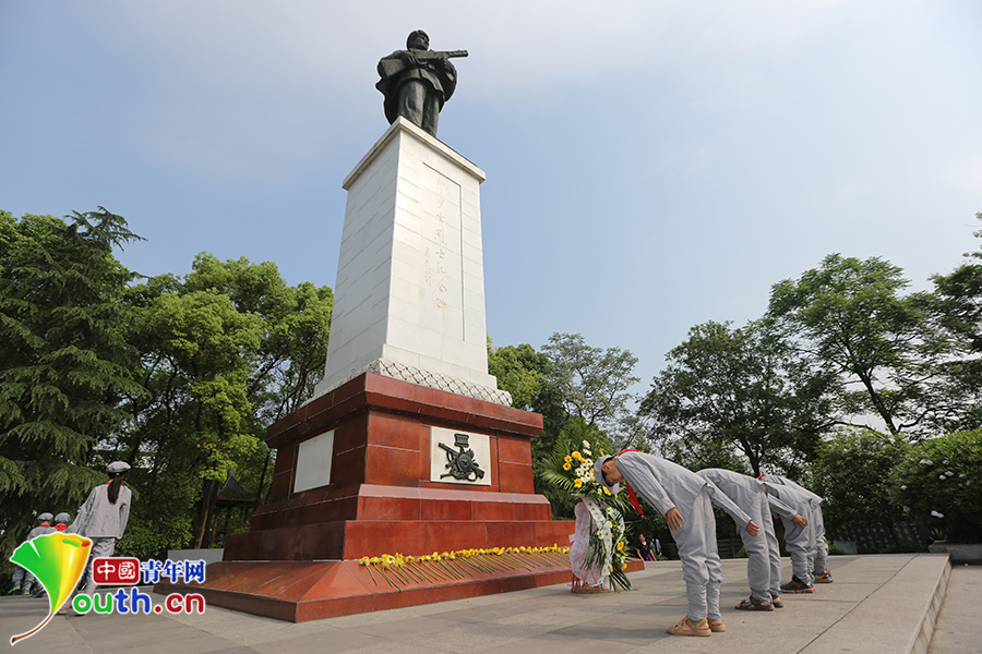 4月21日,重庆铜梁邱少云红军小学少先队员瞻仰邱少云烈士铜像,并向铜像三鞠躬。中国青年网记者 张炎良 摄