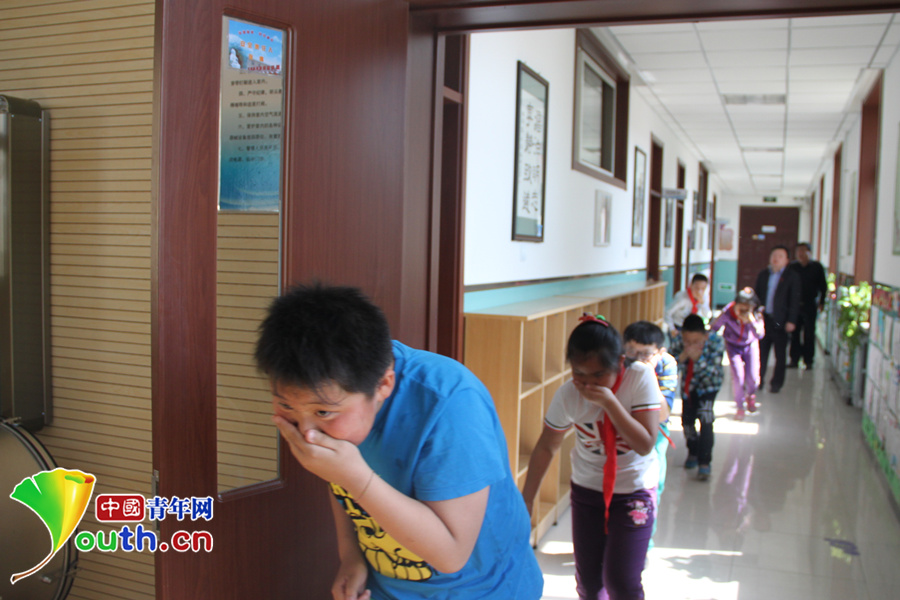 学生们在老师的指导下,弯腰、捂口鼻、紧贴墙壁,有序撤离“起火教室”。 门头沟消防支队 供图