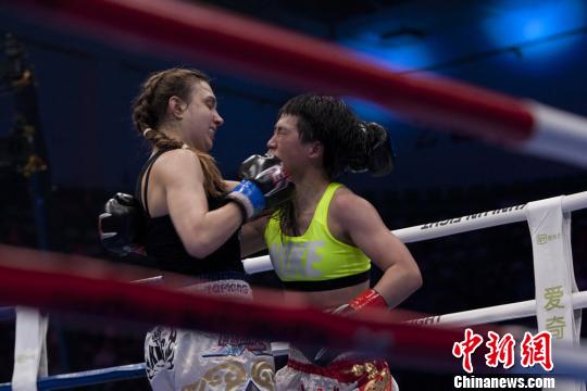 俄罗斯拳手德洛佐娃(图左)与中国拳手鄂美蝶搏击。 杨华峰 摄