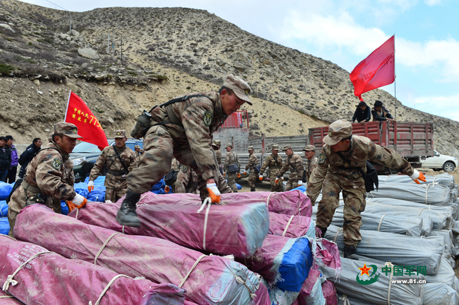 驻藏某团官兵及时卸载帐篷等救灾物资。(特约记者 张震 摄)