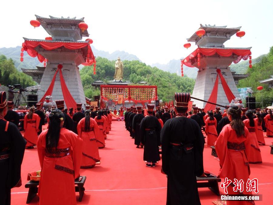 4月26日,近百对新人在道教名山河南栾川老君山着汉式婚服、行古礼举行集体婚典。 曹福川 摄