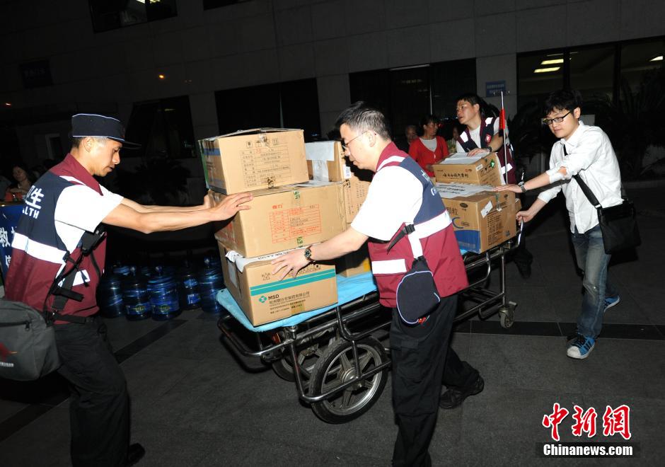 4月26日晚,四川省人民医院大院内国家医疗队队员们正在搬运救灾医疗物资。 中新社发 刘忠俊 摄