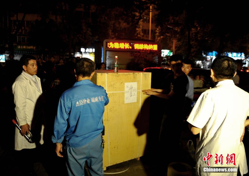 4月26日晚,四川省人民医院大院内工作人员正在打包装运医疗设备。 中新社发 刘忠俊 摄