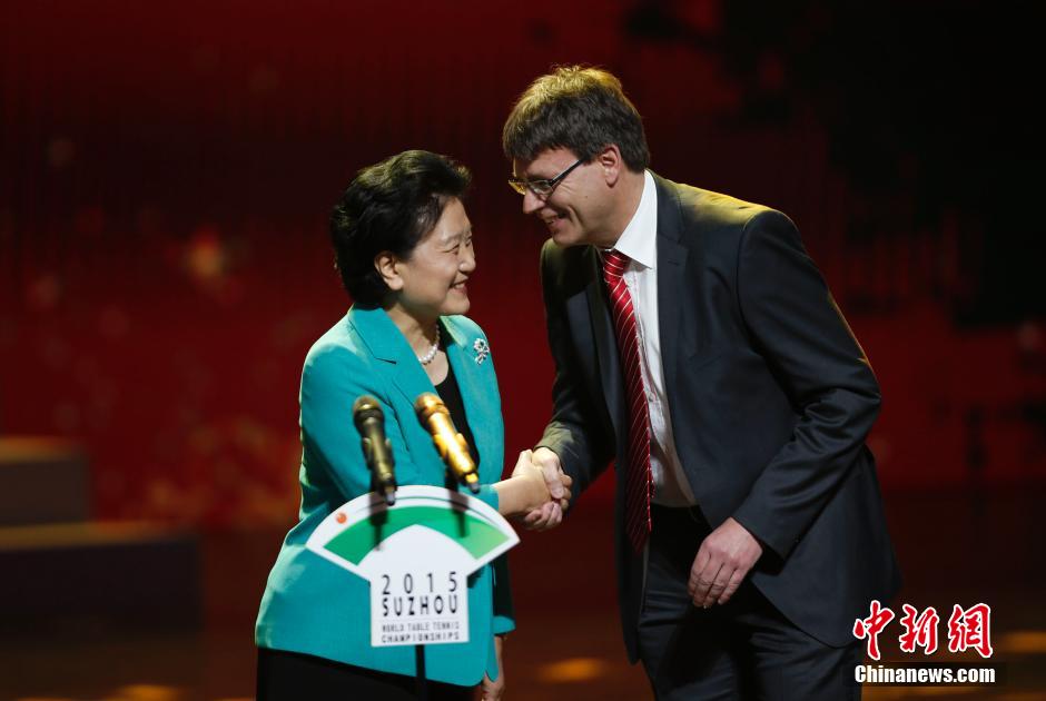 4月25日,2015年第53届世界乒乓球锦标赛开幕式在苏州文化艺术中心大剧院举行,中国国务院副总理刘延东与国际乒联主席托马斯·维克特握手致意。中新社发 刘关关 摄