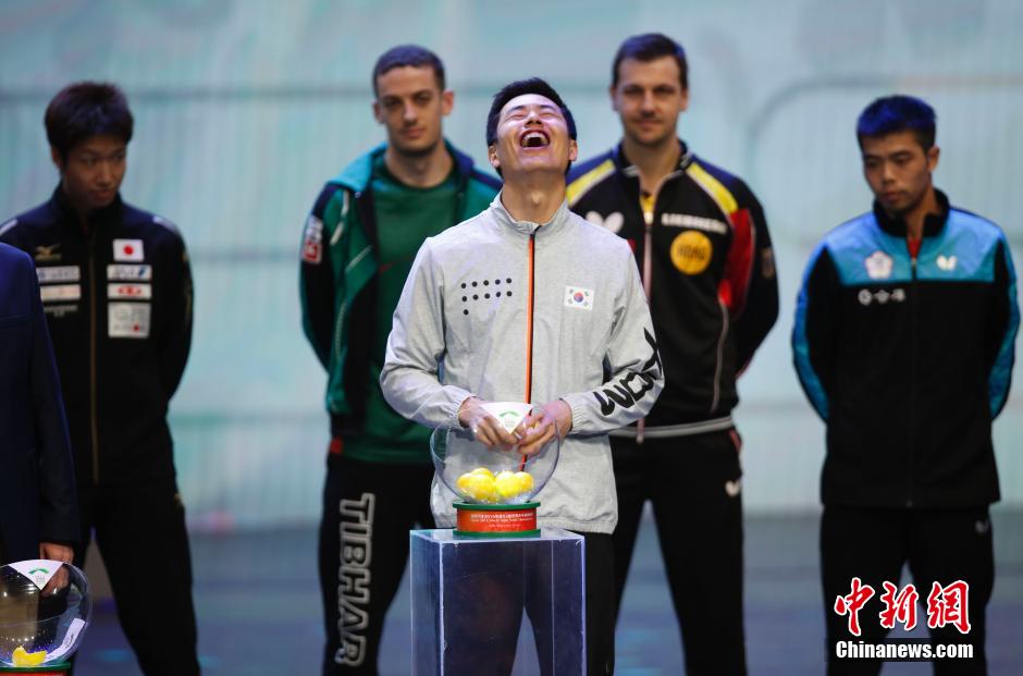 4月25日,江苏苏州,韩国选手朱世赫在2015年第53届世界乒乓球锦标赛男女单打前16名抽签仪式上抽签。中新社发 刘关关 摄