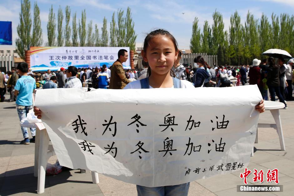 4月25日,王次仲故里全国书法笔会在河北怀来举办,来自京张两地的书法家齐聚怀来,大字书写“墨舞冰雪助力冬奥”,上百位书法爱好者纷纷挥毫泼墨,写下对申办冬奥的期待。图为一名小书法爱好者书写“我为冬奥加油”。中新社发 韩海丹 摄