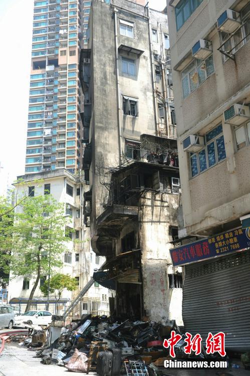 4月27日下午,香港黄大仙一车房爆炸现场继续封闭,消防、政府化验所及机电工程署等部门在现场调查。中新社发 谭达明 摄