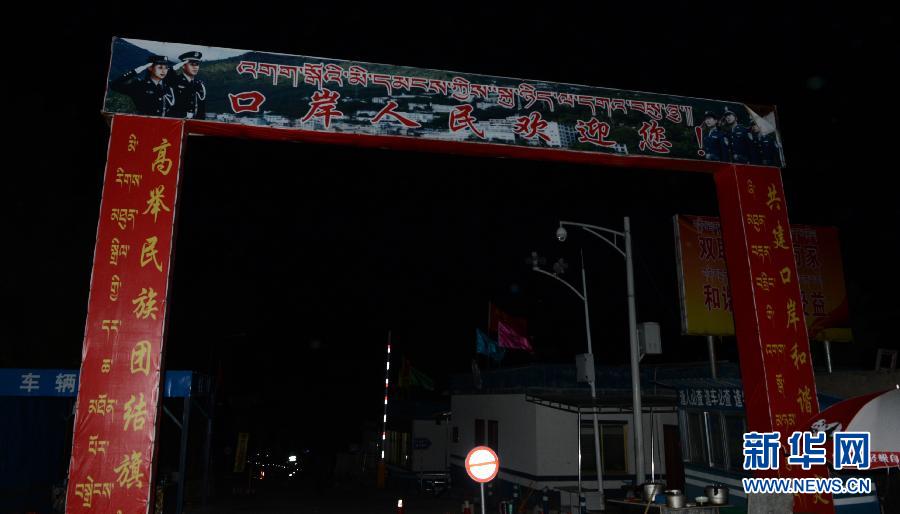 这是4月27日21时许在西藏樟木镇拍摄的樟木镇迎接大门,此时武警日喀则消防支队第一批应急小分队抵达。 27日下午西藏聂拉木县友谊隧道打开第一道口子后,武警日喀则消防支队作为第一批应急小分队,于17时许出发从友谊隧道出发奔赴樟木镇,并于21时许抵达。新华社记者觉果摄