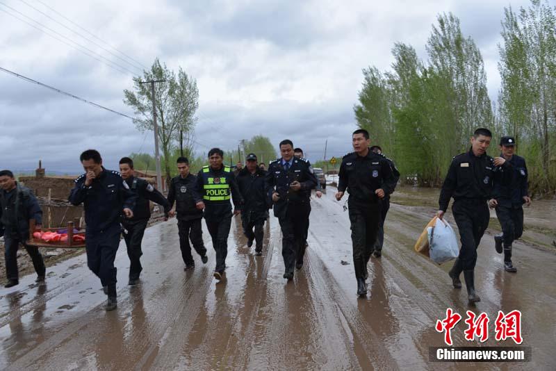 4月27日6时许,新疆额敏县辖区突降暴雨,造成玉什喀拉苏河水位上涨,引发洪水,造成玉什喀拉苏镇、喀拉也木勒镇、额玛勒郭楞蒙古民族乡、杰勒阿尕什镇部分村队受灾,共计3万余亩耕地被冲毁,60余户村民住房受损,60余户群众房屋被淹,农作物受灾。目前,未发生人员伤亡事件,所有受灾群众均得到妥善安置,各项救援抢险、灾后安抚工作仍在紧张有序的开展之中。截至凌晨8时许,经过2个多小时的奋战,先后疏导受灾群众200余名,并将36名被困人员救出险境。图为当地警方争分夺秒跑步前进参与救援。中新社发 丁飞 摄
