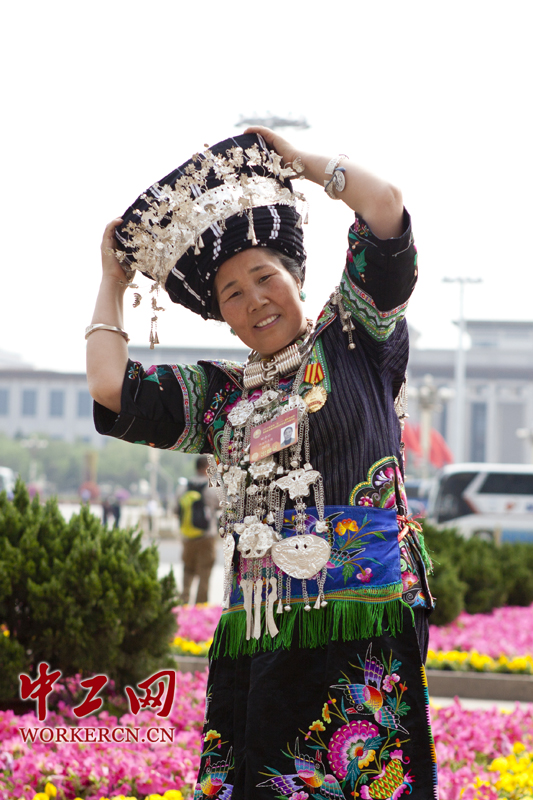 2015年庆祝“五一”国际劳动节暨表彰全国劳动模范和先进工作者大会在京举行。2968名全国劳动模范和先进工作者接受表彰。图为身着少数民族服饰的劳模代表。 中工网记者 李雪峰 摄