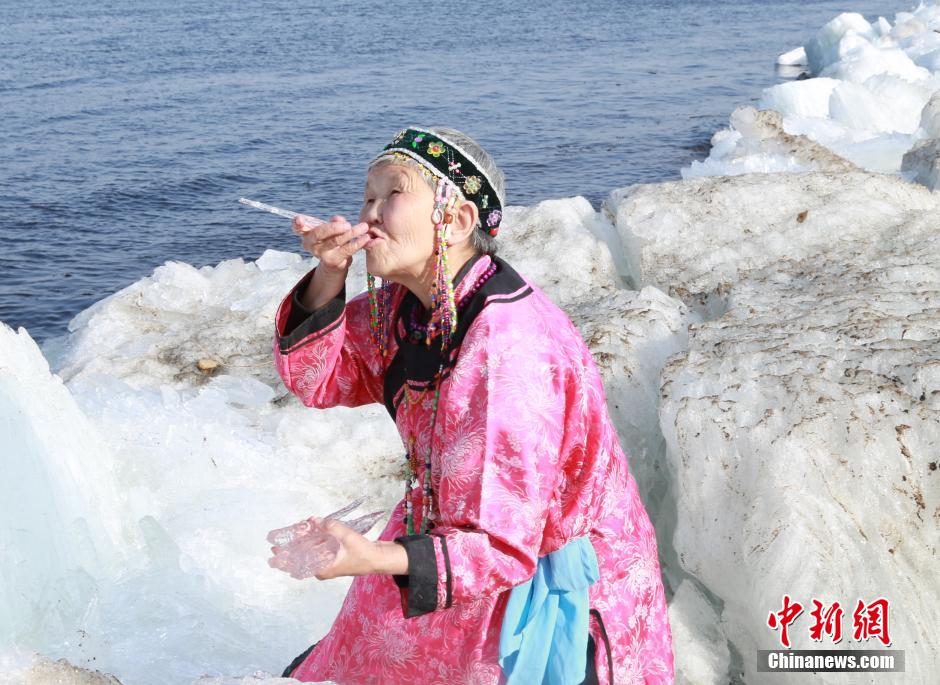 4月28日,中俄界江黑龙江呼玛段举行开江仪式。本次开江节由中国鄂伦春最后的萨满祭祀,以传承中国少数民族传统文化。鄂伦春萨满祭祀有河祀、水祀、火祀等,现在这种宗教仪式已经成为鄂伦春民族文化中最具有代表的一种形式。图为鄂伦春族老人吃开江冰。中新社发 魏来 摄