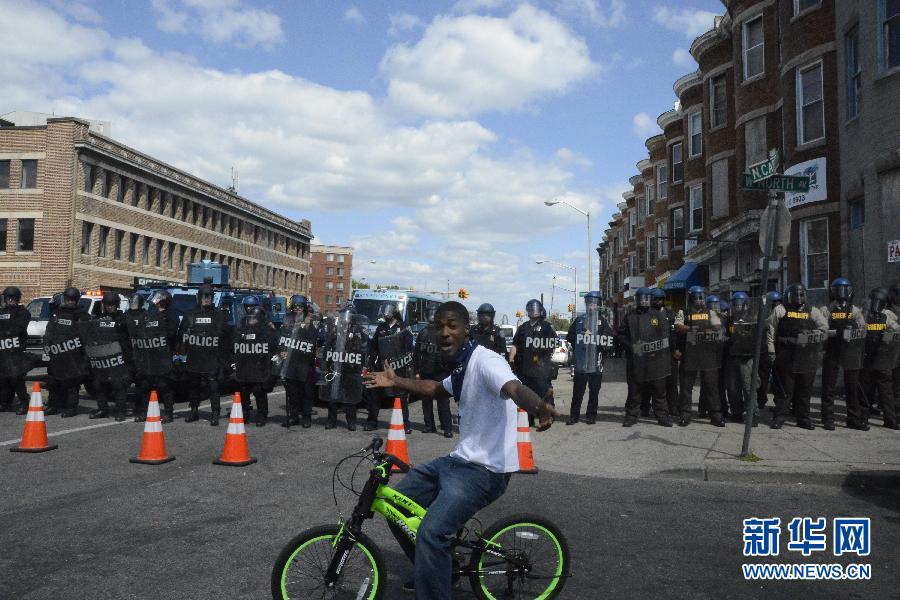 4月28日,在美国马里兰州巴尔的摩市,一名非洲裔美国青年在警戒线外骑单车。当日,美国马里兰州最大城市巴尔的摩在发生骚乱后安保加强,但在北街地区仍有一些示威者与警方展开对峙。 新华社记者 陆佳飞 摄