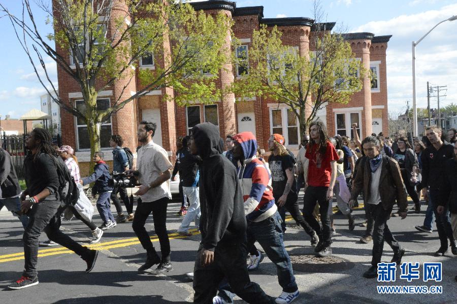 4月28日,示威者走在美国马里兰州巴尔的摩市北街的街头。当日,美国马里兰州最大城市巴尔的摩在发生骚乱后安保加强,但在北街地区仍有一些示威者与警方展开对峙。 新华社记者 陆佳飞 摄