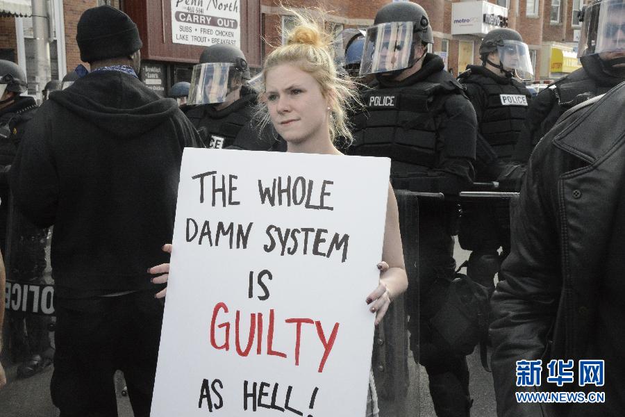 4月28日,在美国马里兰州巴尔的摩市北街地区,一名示威者举着标语。当日,美国马里兰州最大城市巴尔的摩在发生骚乱后安保加强,但在北街地区仍有一些示威者与警方展开对峙。 新华社记者 陆佳飞 摄