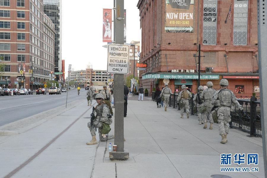 4月28日,在美国马里兰州巴尔的摩市,国民警卫队队员上街执勤。当日,美国马里兰州最大城市巴尔的摩在发生骚乱后安保加强,但在北街地区仍有一些示威者与警方展开对峙。 新华社记者 关建武 摄