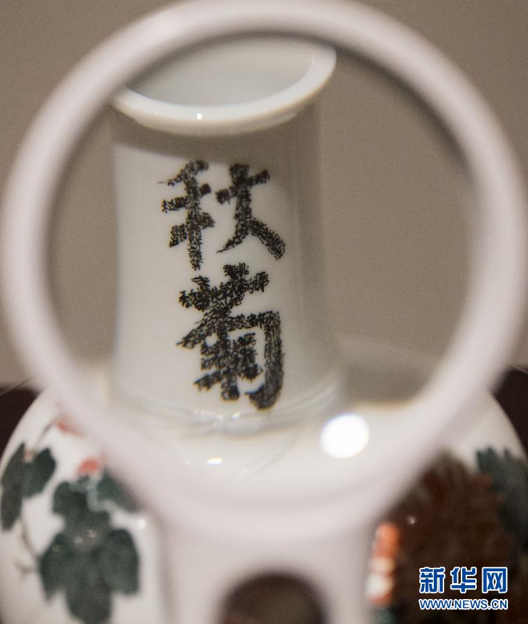 这是4月28日在加拿大多伦多中华文化中心拍摄的在放大镜下呈现的“陶瓷微书”作品。作为2015-2016中国与加拿大文化交流年的一项内容,中国国家级非物质文化遗产——“陶瓷微书”作品展于4月24日至5月1日在加拿大多伦多举行,展览展出了项目传承人王芝文的数十件作品。“陶瓷微书”将中国书法艺术与陶瓷艺术相结合,在不用任何放大设备的情况下,运用难度极高的微小文字在瓷器上创作。新华社发(邹峥摄)