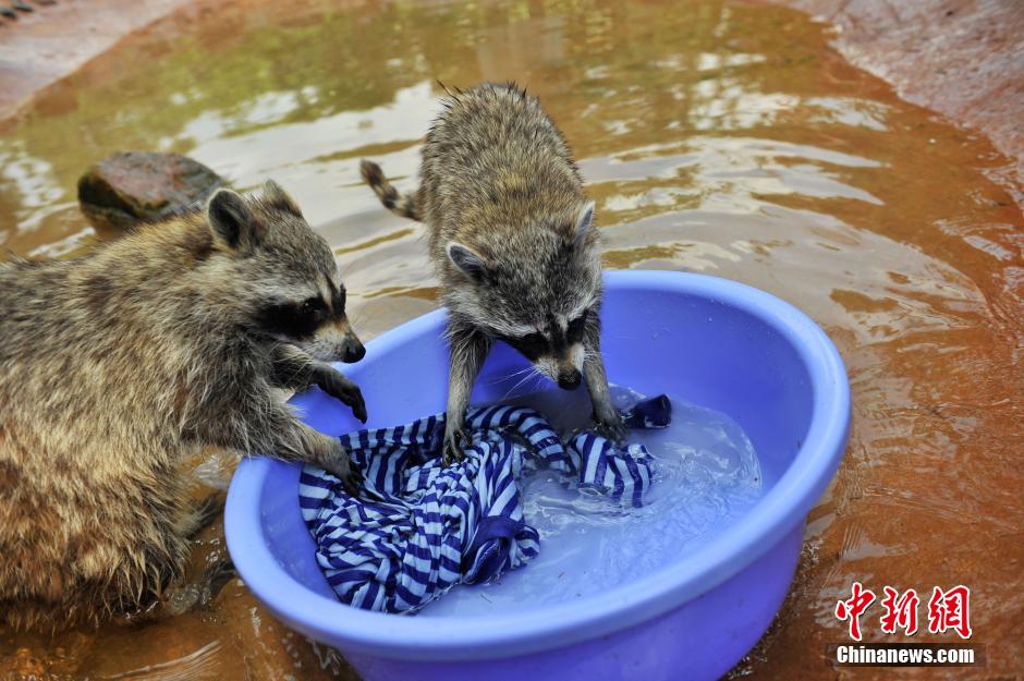动物园评选明星劳模 浣熊现场“洗衣服”