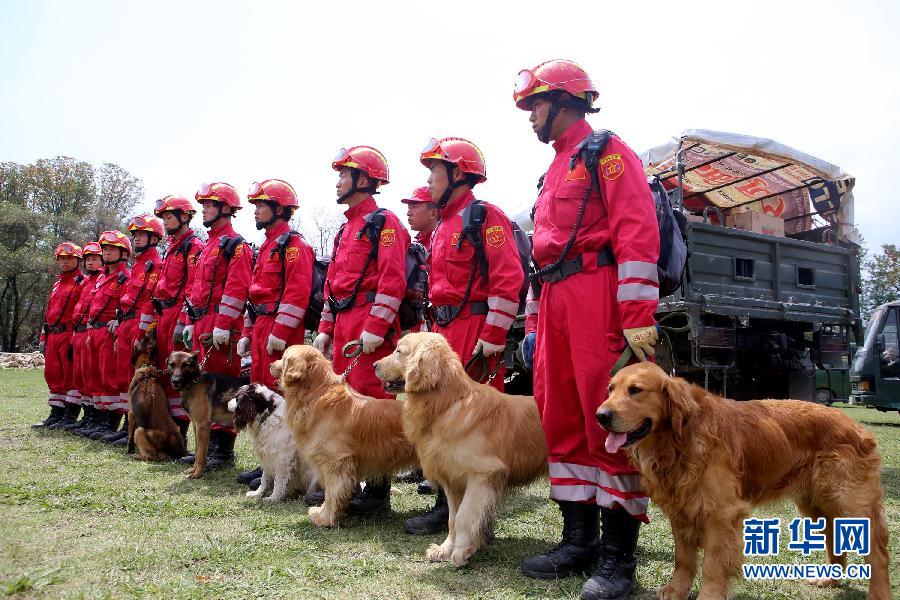 4月29日,中国国际救援队的搜救队员带着搜救犬在营地集结,准备开始当天搜救幸存者的工作。忙碌在尼泊尔地震灾区的中国国际救援队里有这样一组特殊的“战士”:它们不用工具,不惧危险,嗅一嗅、听一听,就可能在废墟里发现幸存者——它们是中国救援队里的“神犬奇兵”。此次在尼泊尔,中国国际救援队共有6只搜救犬投入到搜索幸存者的工作中。新华社记者白阳摄