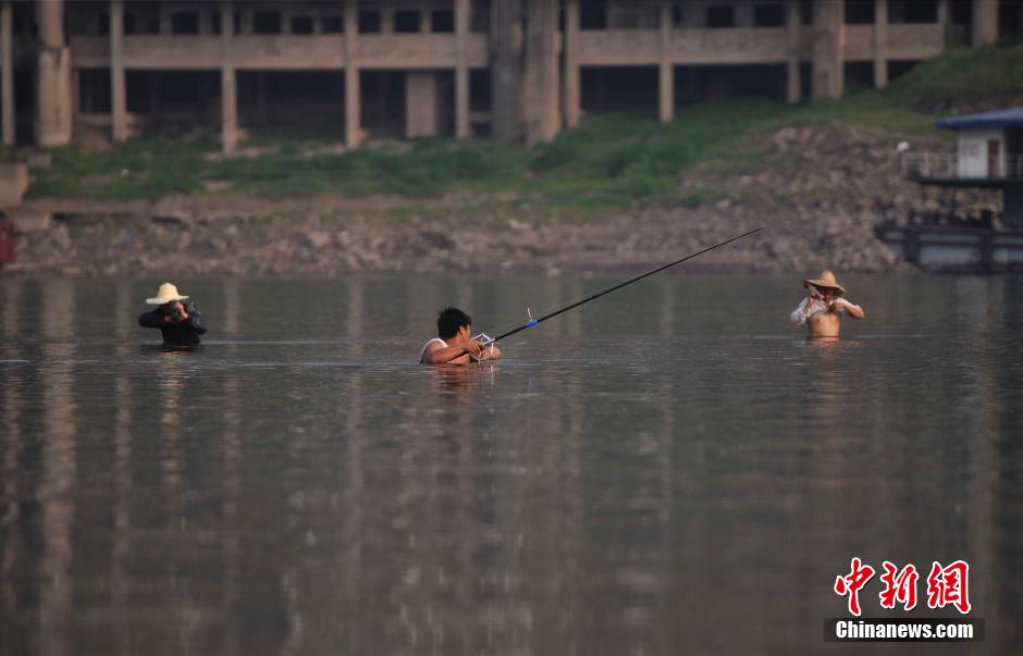 4月29日,嘉陵江重庆段有不少市民浸泡在水中利用抓钩捕鱼,有的捕鱼者在水中只有头部露在水面上,十分危险。 中新社发 陈超 摄