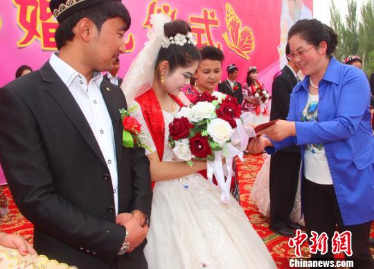 4月29日,新疆库车县阿克吾斯塘乡博斯坦三村广场上欢歌笑语,掌声不断,12对新人牵手走过红地毯,步入婚礼殿堂。