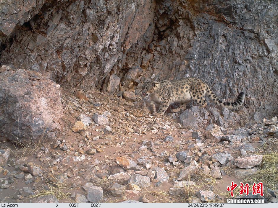 4月29日,中国民间环保组织绿色江河宣布,该组织首次利用红外照相机拍在长江源地区拍摄到活体雪豹图片及视频。图为拍摄到一只成年雪豹在班德山一处悬崖下方的活动记录。这是在长江源头的沱沱河地区首次拍摄到活体雪豹活动图片,进一步证实了雪豹是长江源头地区极其重要的生态环境组成部分。图为雪豹正在活动。 中新社发 钟欣 摄